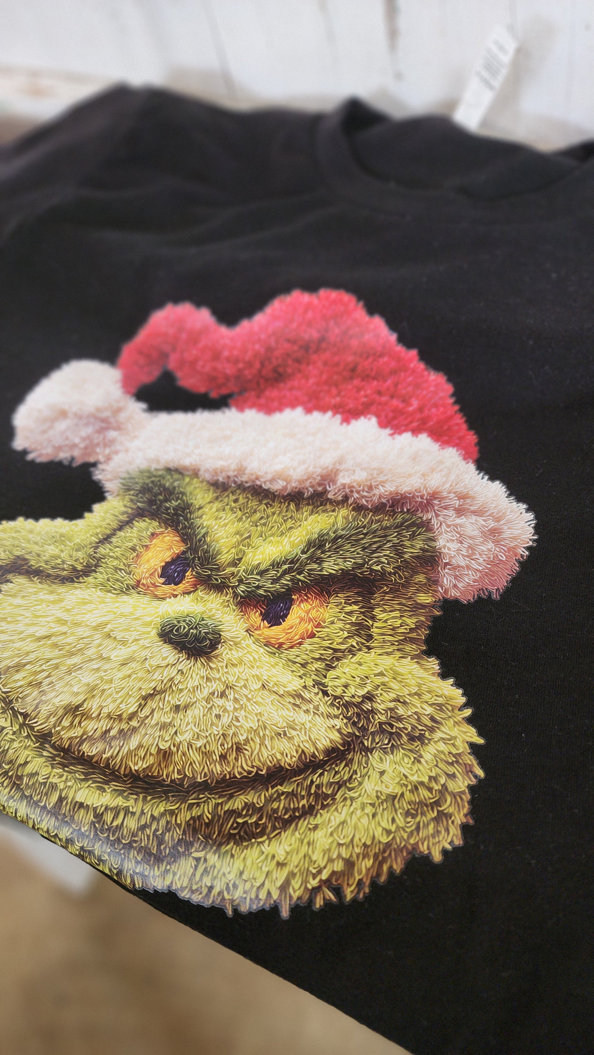 Get ready to spread some holiday mischief in this playful black tee! Featuring a faux embroidered graphic of The Grinch's iconic face, it's the perfect way to channel your inner curmudgeon this season. Whether you're a devoted fan or just love a touch of festive fun, this tee combines comfort with character. Cozy, quirky, and undeniably cute—your wardrobe just got a whole lot more mischievous.
