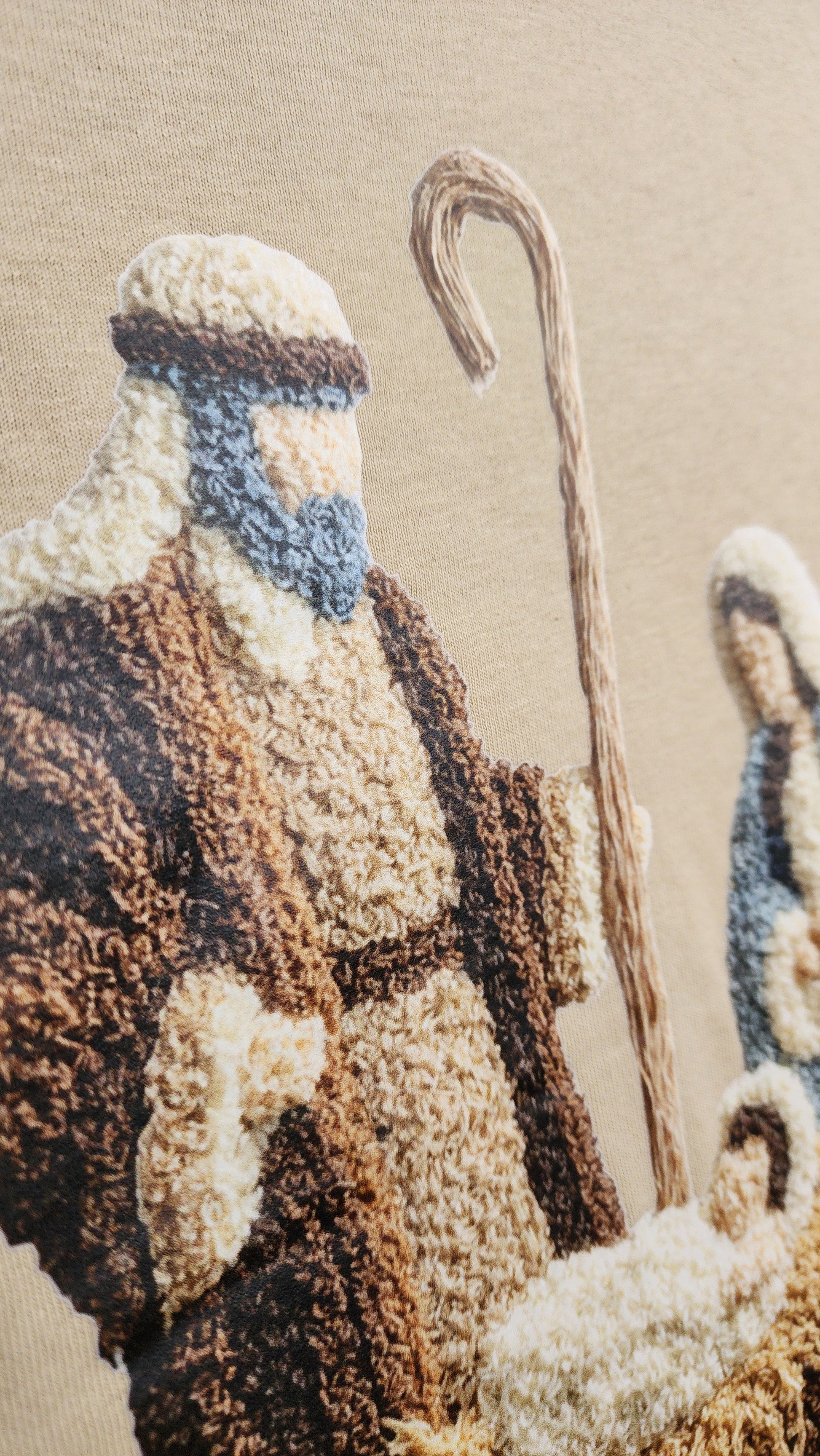 Celebrate the sacred story with our Faux Embroidery Nativity Tee. This tan M&O classic features an intricately pressed graphic depicting the birth of Jesus—a timeless moment rendered with artistic detail. The faux embroidery effect adds dimension and texture, creating a piece that's both spiritually meaningful and visually striking. Perfect for those who want to wear their faith with style and reverence. Comfortable, quality construction meets meaningful design in one wearable tribute.